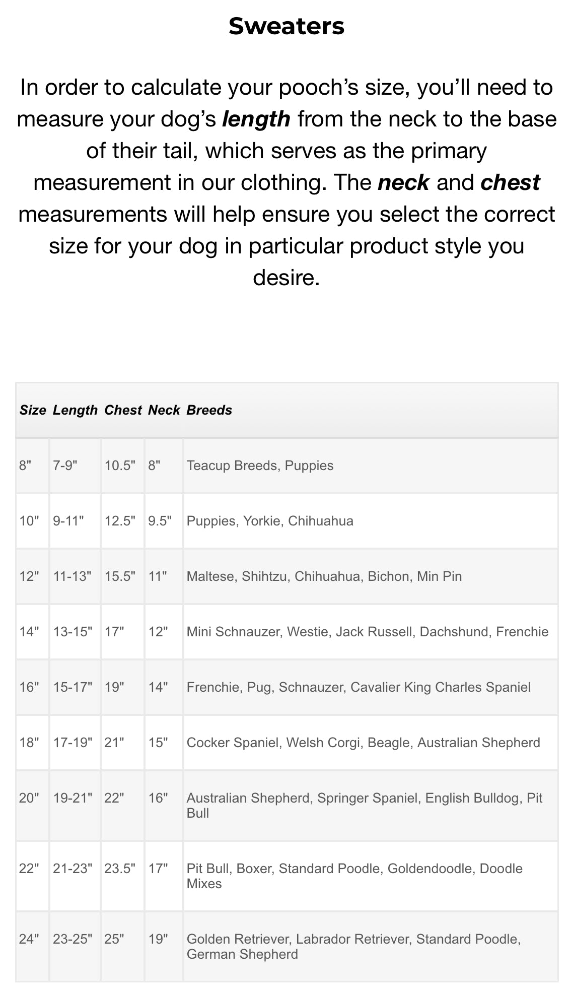 Specs: 100% Acrylic Super Soft Knit, Harness Hole, Machine Washable/Lay Flat to Dry, Sizes are the length of the dog in inches from the base of the neck to just before their tail.